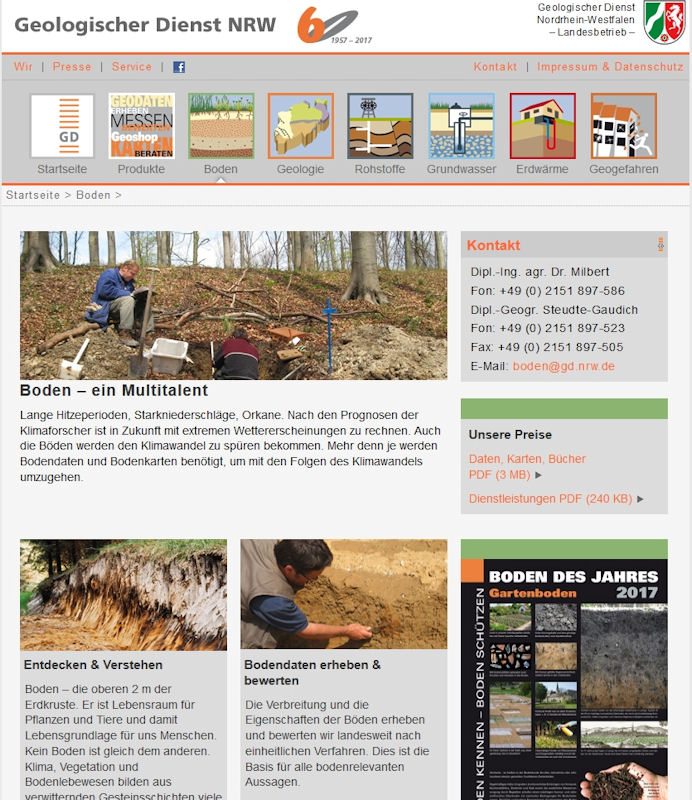 Der Geologische Dienst NRW ist die geowissenschaftliche Einrichtung des Landes Nordrhein-Westfalen. Wir erforschen seit 60 Jahren den Untergrund im gesamten Bundesland. Unsere Themenfelder sind Geologie, Boden, Rohstoffe, Grundwasser, geophysikalische und geotechnische Untergrundeigenschaften sowie Geothermie. Wir ermitteln Daten zur Risikovorsorge bei Gefahren, die vom Untergrund ausgehen, und betreiben das landesweite Erdbebenalarmsystem. Unsere Erkenntnisse stellen wir der Politik und Verwaltung, der Wirtschaft und den Bürgerinnen und Bürgern zur Verfügung. Unsere Produkte umfassen Karten, Daten und Schriften. Viele dieser Informationen sind über unsere Onlinedienste frei zugänglich.