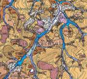 Eine Bodenkarte zeigt deutlich die Vergesellschaftung von Böden in der Landschaft. So fallen sofort die blauen Farben in den Tälern auf, die für vom Grundwasser beeinflusste Böden stehen. ©HLUG