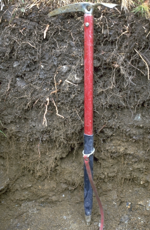 Foto: Die Abbildung zeigt einen Kolluvisol (Kolluvium über jungpleistozänem Solifluktionsschutt über Kalkglimmerschiefer) in den Hohen Tauern (Matreier Becken, Osttirol, Österreich). Profil: Ah/M/IIM/III lCv/IVmCn.