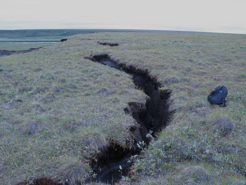 Die Wissenschaftler wurden zudem im August 2007 Zeuge, wie sich innerhalb weniger Tage bis zu 100 Meter lange und 13 Meter tiefe Risse im Plateau bildeten und ein 800 Quadratmeter großer Block in die Tiefe stürzte. „Ein solcher Abbruch läuft nach einem festen Muster ab. Zuerst taut der Fluss die Steilklippe an und spült eine Nische in ihren Sockel. Von dort ausgehend bilden sich entlang der großen Eissäulen Risse im Boden. Der Block löst sich anschließend Stück für Stück von der Klippe und stürzt ab“, erklärt Jens Strauss.