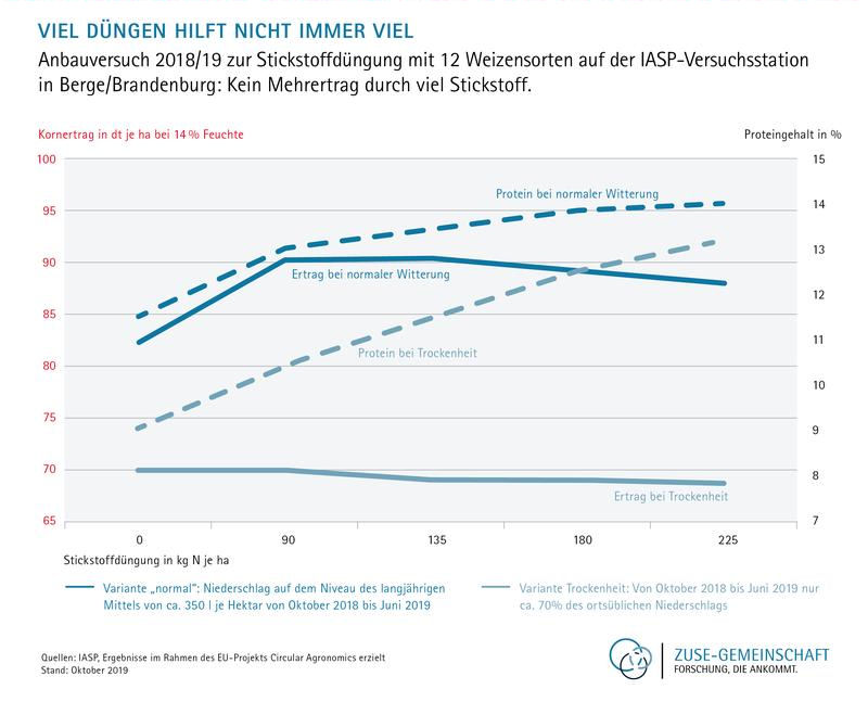 Für den Ertrag von Ackerpflanzen ist die Versorgung mit Stickstoff (N) ein zentraler Faktor. Doch viel N-Düngung hilft nicht immer viel, wie Zwischenergebnisse eines Forschungsprojekts am Institut für Agrar- und Stadtökologische Projekte an der Humboldt-Universität (IASP) zeigen. An zwölf gängigen Weizensorten testeten die Berliner Forscher auf der IASP-Versuchsstation in Berge bei Nauen den unterschiedlich starken Einsatz von N-Dünger. Dabei zeigte sich: Hohe Stickstoffgaben gingen im Mittel der 12 getesteten Sorten auf dem lehmigen Brandenburger Sandboden des Versuchsstandortes bei Trockenheit mit leicht niedrigeren Getreideerträgen pro Hektar einher. Bei normalen Witterungsbedingungen sank der Ertrag sogar ab einer Stickstoffdüngung von 135 kg N pro Jahr und Hektar (ha) deutlich. Hingegen reagierten die Pflanzen auf verstärkte N-Gaben bei Trockenheit mit höheren Eiweißgehalten. „Schon N-Düngung in praxisüblicher Dosierung führte auf den leichten Böden des Versuchsstandortes offenbar dazu, dass Ertrag weggedüngt wurde, während hingegen die Eiweißgehalte des Weizens weiter stiegen“, erklärt IASP-Versuchsleiter Dr. Andreas Muskolus zu den Resultaten des ersten Anbaujahres im vierjährigen EU-Verbundprojekt Circular Agronomics. Er regt ein Umdenken im Handel an, wo hohe Eiweißgehalte über dem für gute Backeigenschaften notwendigen Niveau weiterhin mit Zuschlägen honoriert werden. Sparsamere Anbaumethoden hätten es damit schwerer. Vielmehr sieht Muskolus die Züchtung am Zuge, stärker auf die Wurzelentwicklung der Pflanzen Wert zu legen, um den Pflanzen in trockenen Zeiten zu helfen.